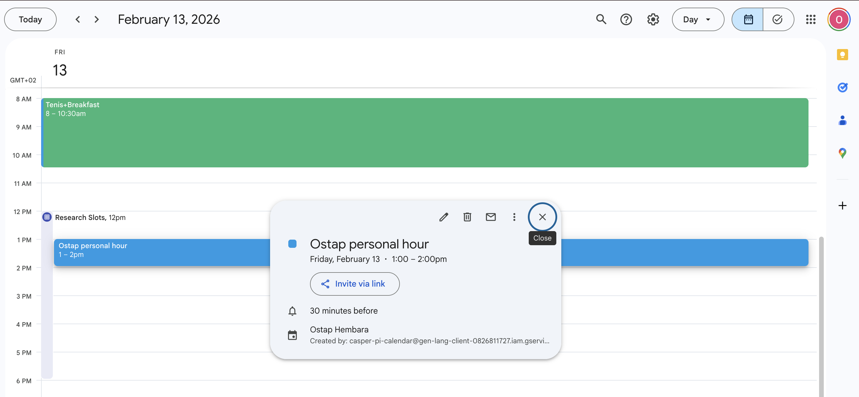 Plain English commands: "Schedule a tenis practice session for this Friday at 9am" Done. But the real flexibility comes from the Telegram bot and webhooks I set up. Sometimes I'm not near the Pi. So I text Casper: "Add dentist appointment Friday 2pm" or send a voice message: "Remind me to review the deployment docs tomorrow." Commands in text or audio, from anywhere. The to-do list grows, meetings get scheduled, and I don't have to break flow.